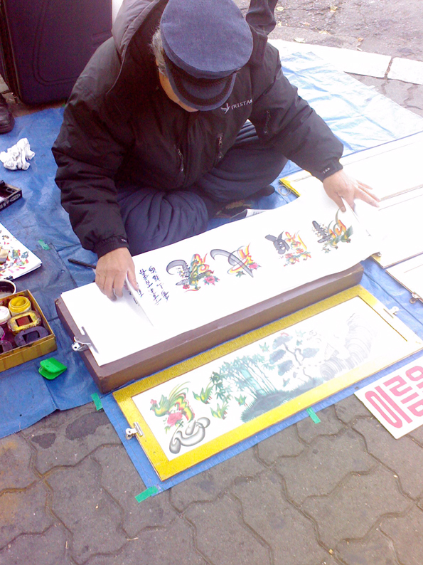 동대문운동장 앞 길가에 앉아서 사람들이 원하는 글자를